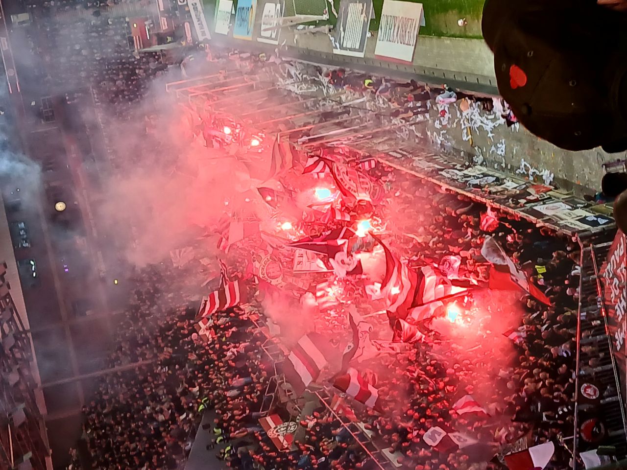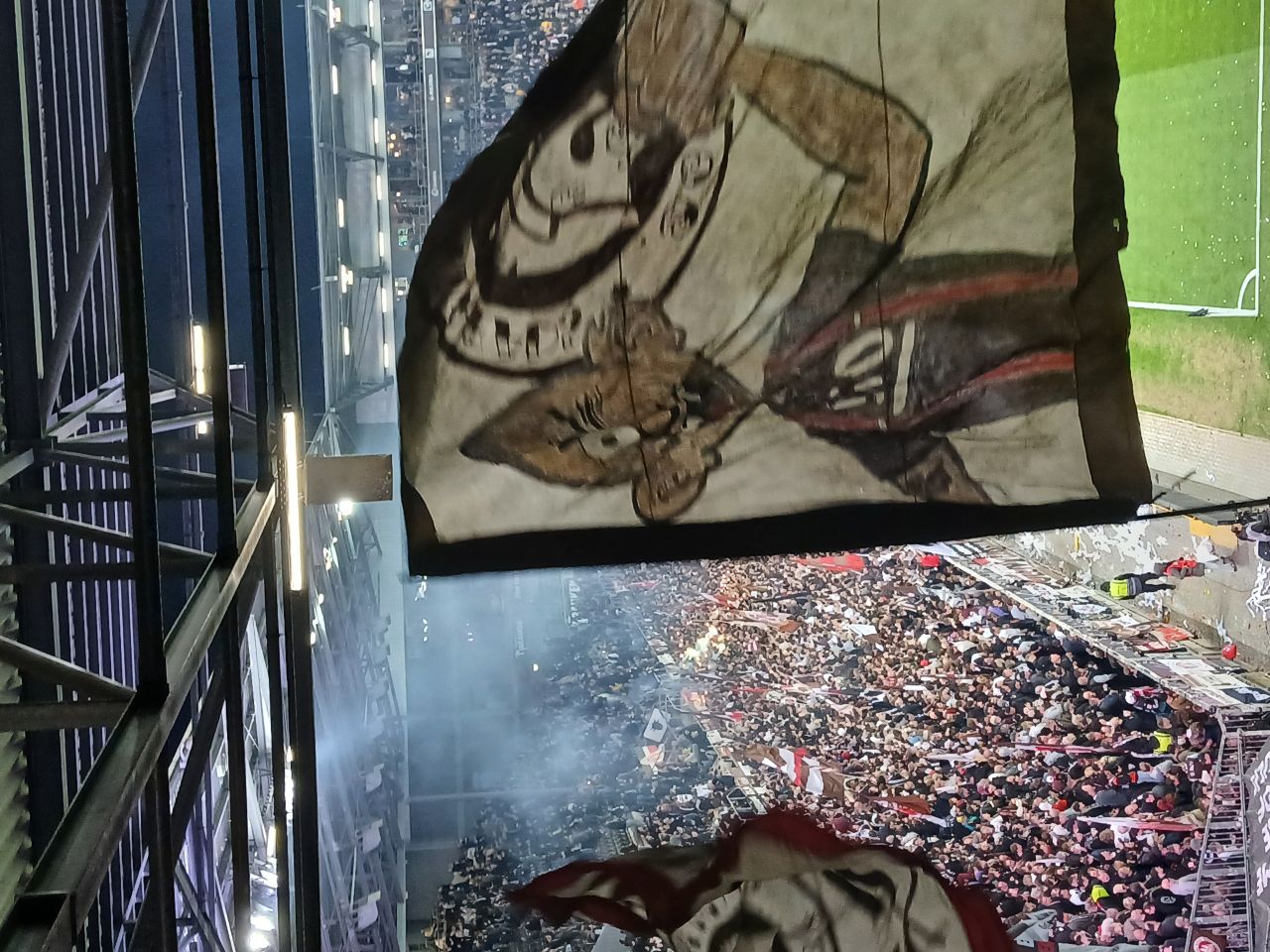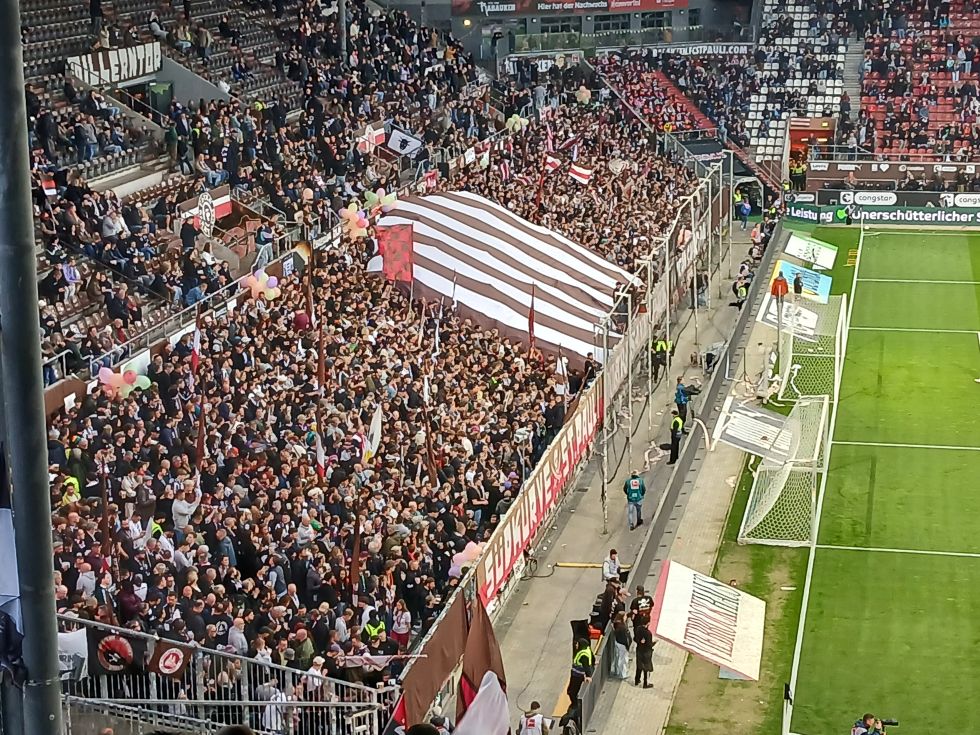 Dann klappte es noch, dass ich mich mit Maik treffen konnte, kurzer Schnack und dann ging ich in Block 1. Dort gleich Christoph getroffen, welchen ich auch durch viele Auswärtsfahrten kenne. Einige würden jetzt sagen: 'ah, von früher also'. Unverschämtheit! Etwa eine Stunde vor Spielbeginn war ich am Platz, mit einem leckeren Wasser. Eine Beschwerde habe ich dennoch. Nein, nicht dass man mit Karte zahlen kann, dies finde ich echt gut. Doch, dies ist leider andernorts ebenso, wird auf dem Display die Optionen für Tipp angezeigt und man muss offensiv ablehnen. Dies finde ich echt mies. Wie gesagt, nicht nur am Millerntor, sondern auch in Bars & Restaurants. Auch wenn nicht in bester Qualität dennoch wollte ich es unbedingt hier posten. Warum? Weil ich den Ausblick vom Block 1 auf den Hafen so derbe finde. Wie dem auch sei. Dann hatte ich das Glück, meinen Lieblings-Stefan zu treffen. Wir stellten fest, dass wir zwar über Social Media unterwegs sind, doch uns viel zu selten sehen. Dann schon mal die Vorbereitungen für die Einlaufchoreo.